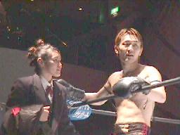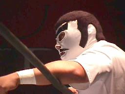 話題(?)の「北野インフェルノ」(左写真)。試合前のインタビューコーナーでコニカマンに「強力な助っ人」と紹介されながらもボケまくり。凄いの持って来たなあ。