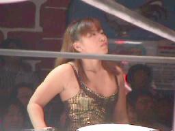 この試合は「4Way」と発表されていたが「鴨居が誰かから一本取るか誰かが鴨居から一本取った時点で終了」とルールの説明。佐野はカゴ一杯の凶器持参。トリプルMはスレッジハンマー持参、ステファニー代わりに宮崎有妃(右写真)を帯同。3人の挑戦者が入場し、鴨居のテーマが流れる。しかし入ってこない。鴨居の映像が出る。「このベルトはオレのもんだ!欲しかったら俺のこと探してみろ!」探し出す3人。なぜか観客のカバンの中を捜索するファンクさん。グレースが「(あの映像は)階段でしたよ。」とサジェスチョン。みんなで階段に探しに行く。