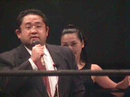 スーザンと三和社長がリングイン。スーザンが三和社長に「重大発表」を促す。三和社長「政治の世界でも構造改革が進んでおり、各界でベルリンの壁が壊されています。今日、ここで我々DDT首脳陣もベルリンの壁を壊すため、ある勢力とパートナーシップを結びます。」(左写真)