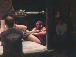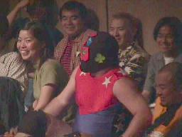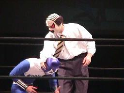 北沢タウンホールのリング上に勝負の場を移した2人(左写真)。履歴書変造男はパンチ、ヘッドロック、コニカマンはロープに振る、履歴書変造男はタックル。2発目はコニカマンがリープフロッグでかわしてすくい投げに、しかし履歴書変造男ブロックして逆にすくい投げ、マスクはぎに。正義のヒーローの「マスクがはがされる」というのは前代未聞だなあ。コニカマン必死に抵抗。