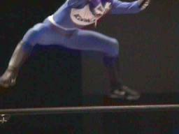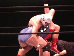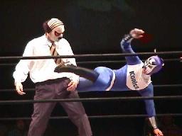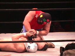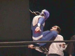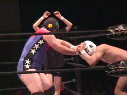 履歴書変造男パンチ、キックからロープに振ってオクラホマスタンピード、カウント2。履歴書変造男肩にかつぐ、コニカマン着地すると延髄蹴り2発(左写真)。