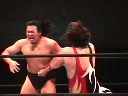 保坂ヘッドロック、藤沢ロープに振る、保坂タックル。藤沢耐える。藤沢ロープに飛んでタックル、相打ちに。3発目藤沢が保坂を吹っ飛ばす(右写真)保坂は場外にエスケープ。藤沢追いかけてリングに戻す。