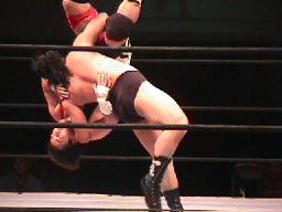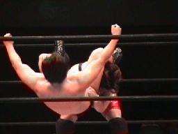 保坂投げっ放しのサンダーファイヤーパワーボム(右写真)、カウントは2。ブレーンバスターの体勢、藤沢は首固めに、カウント2、藤沢スクールボーイ、カウント2。コーナーに振って串刺しエルボー。