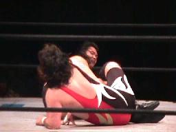 保坂チンロック(左写真)、藤沢ハンマーロックに切り返す、保坂切り返して腕ひねり上げる。ロープに振ってエルボー、座らせた状態でコブラツイスト、藤沢ロープ。保坂は藤沢を場外に出すと鉄柱、イスで藤沢の腕を攻める。リングに戻ってもロープで締め上げる。5分経過。