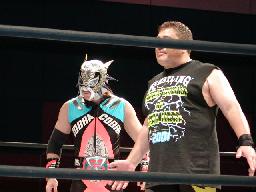 ロープワークから北野ラリアット、ロープに振る、COBRA飛びついてコルバタ(左写真)、両軍タッチ。リチャードホイップ、ロープワークからベルティゴホイップ、リチャードを落とす、両軍タッチ。北野はCOBRAを座らせて回転式ネックブリーカー。ロープに振る、COBRA高速ウラカン・ラナ、カウント2。COBRAドロップキック、北野場外転落。