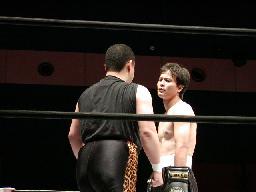 菊蛇ワとブラックは2人で「やめてくれ」ポーズ。菊蛇ワ目突き、橋本ブロック、ブラック目突き、橋本ブロック、菊蛇ワ急所蹴り、橋本足ではさむ、ブラック急所蹴り、これはよけれず。橋本は鳥羽にタッチ。ブラックも蛇影にタッチ。鳥羽パンチ連打(左写真)、蛇影は正拳突きで対抗。5分経過。