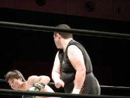 橋本肩にかつぐ、蛇影十字架固めに丸め込む、橋本の足がロープにかかりノーカウント。橋本再度肩に担ぎ上げ、10回転した後肩車(左写真)、カウント3。