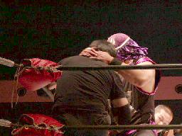橋本入るとすぐにSTO(右写真)。橋本肩車、菊蛇ワがカット。ブラックが鳥羽を場外に落とす。藤沢も場外に。橋本もう一発STO。藤沢はブラックに場外でブレーンクロー。