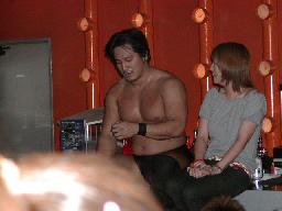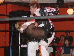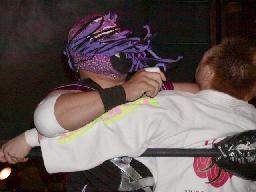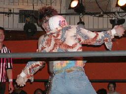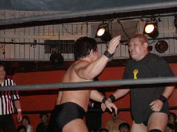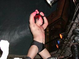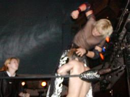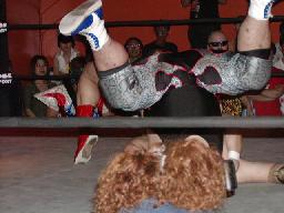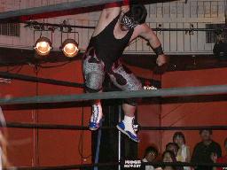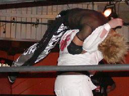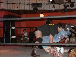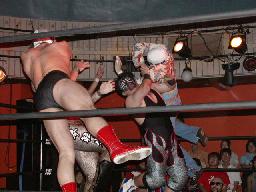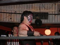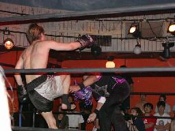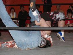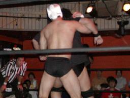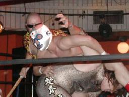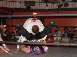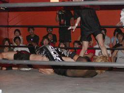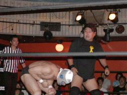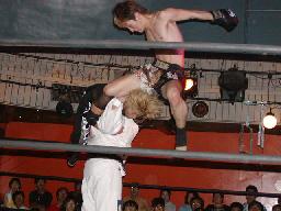 カブキク蛇ワラリアット、ロープを歩いてからフィストドロップ(右写真)、高木かわす。高木ストーンコールドスタナー、ファイナルアンサー?でカブキク蛇ワをフォール。