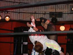 80が入ってポイズンと手四つ、力比べ(右写真)。80押し込む、ポイズンブリッジ。80が乗ってもポイズン大丈夫。80のしかかる、ポイズン引っくり返して上に。しかし80はそれを逆吊り天井に。こんな技久しぶりに見たぞ。80ロープに飛ぶ、エプロンからヘビダーが竹刀。高偽が入ってラリアット、80も高木にタッチ。