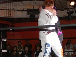 MIKAMIコーナーに上ってダイビングセントーン、カウント2。飛びつき十字に行くが一発目スッポ抜け、2度目は橋本が受け止め(右写真)、そのままボム風に叩きつける。カウント2。