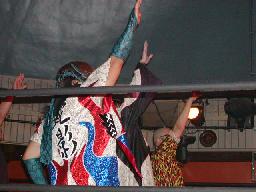 吉田が握手を求める。吉田も「あんちゃん」に戻ったか?しかし蛇影は拒否して手を上げる(右写真)。ロックアップ、吉田ヘッドロック、蛇影ロープに振る、吉田タックル。吉田首投げからスリーパー、蛇影切り返して肩口にニースタンプ。両者立ち上がる。蛇影腕をひねる、吉田切り返してワキ固めに、蛇影ロープ。