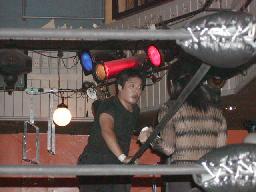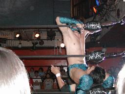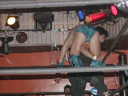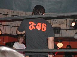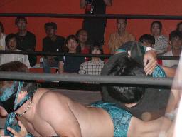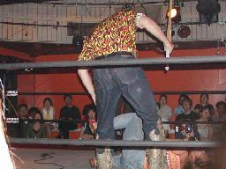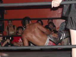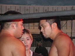 ロックアップ、佐々木ヘッドロック、石井ロープに振る、佐々木タックル、両者倒れず。今度は石井がロープに走ってタックル、佐々木倒れず。佐々木ロープに飛ぶ、石井チョップ、佐々木かわす、石井ラリアット、佐々木かわしてタックル、石井場外エスケープ。佐々木は場外に追って客席でチョップ、キックの打ち合い(右写真)。「ハードヒット路線」への回帰かな?>佐々木。佐々木リングに戻してストンピング。