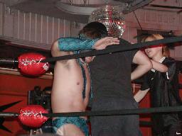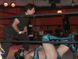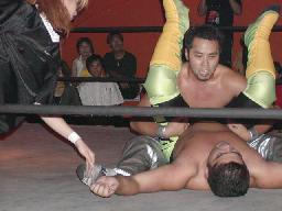 さらにセクシーブロンコバスター(左写真)。サッカーボールキック連打から三角絞め・・・・・・かなあ、これ?とにかく吉田ロープエスケープ。