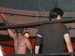 佐々木ロープに振ってキック、自らロープに飛んで顔面キック。久々の「バキューン!」ポーズ出る。石井場外に逃げるが佐々木は連れ戻し、コーナーに逆さづりにしてスライディングキック(左写真)。佐々木コーナーに振る、石井切り返す、佐々木カウンターでキック、佐々木突っ込む、石井抱え上げて水車落とし。5分経過。