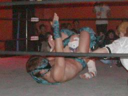 吉田アニマルエルボー2連発から久々のエキサイティングスコーピオン(右写真)。蛇影がカット。蛇影は吉田を場外に出す。