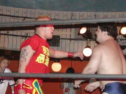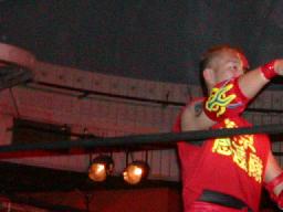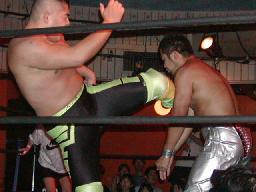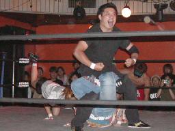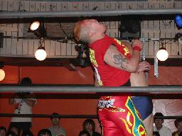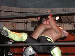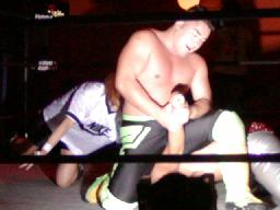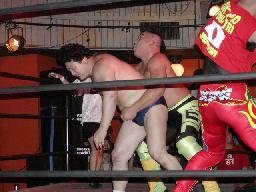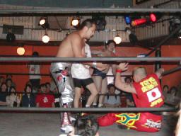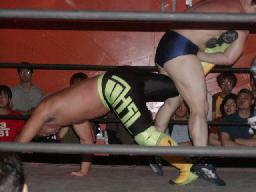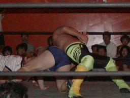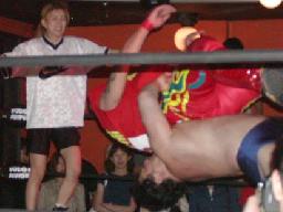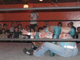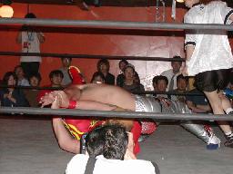 NOSAWA変形のリンギーナ(右写真)、佐々木ロープ。20分経過。NOSAWAは佐々木の両足をヌドのように固めてエビ固め、カウント3。
