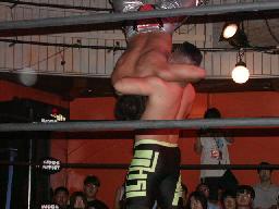 80は2人をロープに振りフライングクロスアタック連発。80コーナーに上る、蛇影追いかけて雪崩式セクシーフランケンシュタイナー(左写真)、しかしカバーは吉田がカット。5分経過。