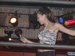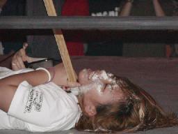 休憩後、ケーキ(?)を食う宮崎の映像。しかし何物かに頭を押され突っ伏す。それを見てうれしそうに笑うスーザン(左写真)。宮崎顔中クリーム付けて入場。しかしすぐにヘビダーの竹刀、蛇影のセクシー攻撃、スーザンのビンタを喰らう。
