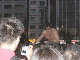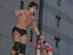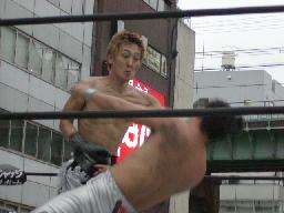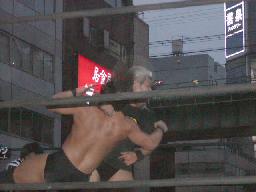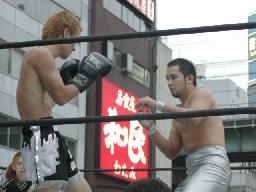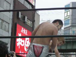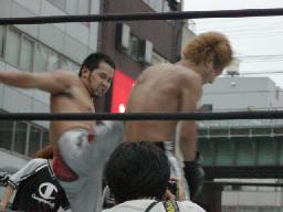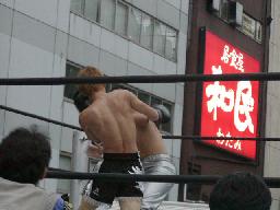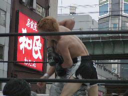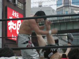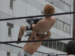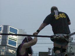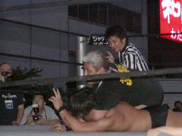 高木と高偽リングに上がってラリアット合戦、相打ちの末高偽が勝つ(右写真)、カウントは2。NO蛇リングイン、パンチ、サミング、ヘッドバット、ドロップキックの猛攻。