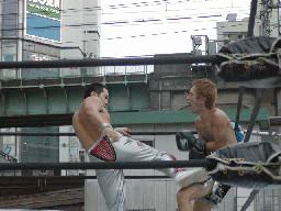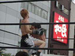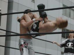 鳥羽起き上がるとヒザ蹴り(右写真)、ソバットで逆襲。鳥羽ハイキック、佐々木場外転落。鳥羽もリング上でダウン。
