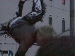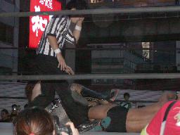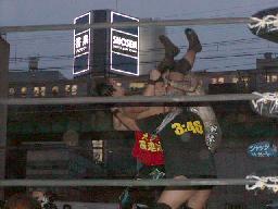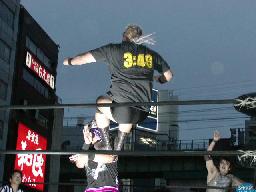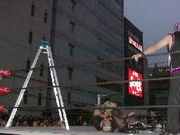 宇宙が入り高偽とNO蛇に立て続けにパワーボム。NO蛇場外転落。MIKAMIがハシゴの上から高偽にスワントーン・ボム(右写真)。