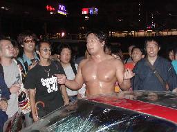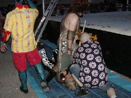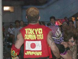 乱闘スタート、MIKAMIはドロップキックでポイズンを場外に落とすとトルニージョ(左写真)高木はNO蛇を連れてフェラーリのある方へ向かう。高偽が妨害(というかフェラーリを守る)。ポイズンはリング上でMIKAMIにスリーパー。MIKAMIロープ。MIKAMIドロップキック、高木にタッチ。高木はポイズンの首をロープに掛けてヒップドロップ、カバーは高偽がカット。ポイズン急所打ち、高偽にタッチ。高偽グーパンチ、ヘッドロック。高木ロープに振る、高偽タックル。ロープワークから高木ドロップキック。チョップ合戦は高木制す。