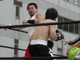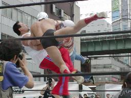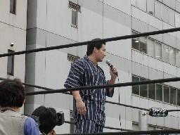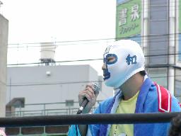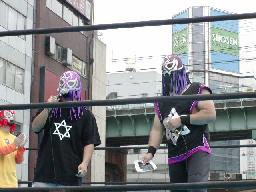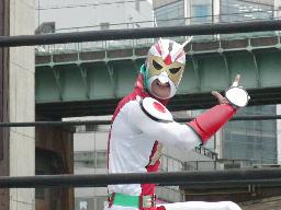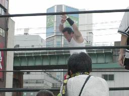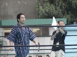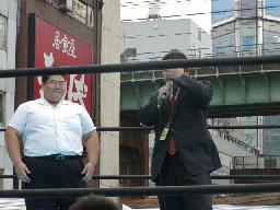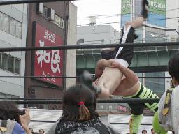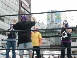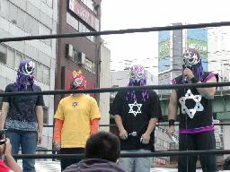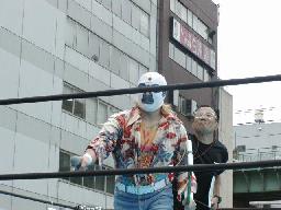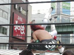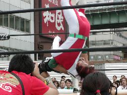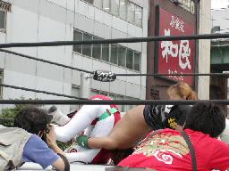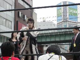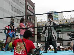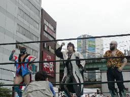 3時になり、イベント開始。まずは高木がリングに上がり(右写真)「レスラーそっくりさん&ものまね大会」。直前に応募を開始したせいか(?)事前応募者は横浜の「ナンブくん」一人。あと一人飛び入りで参加するも優勝はナンブくん。高木より後日レスリングシューズなどの豪華賞品が送られるとか?