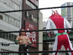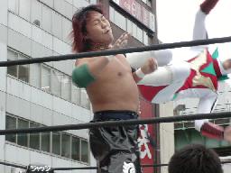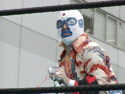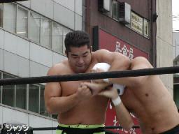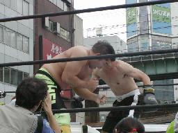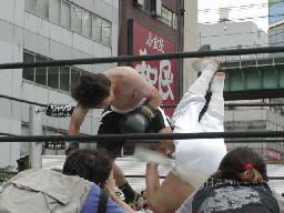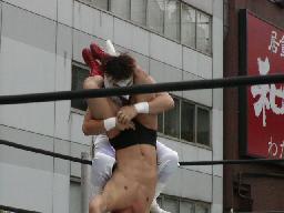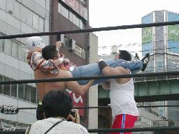 鴨居パンチ打つ(右写真)、しかし石井はすぐに立ち上がって鴨居をカナディアンバックブリーカーに担ぎ上げるとそのまま前方に投げ落とす。戸井にタッチ。
