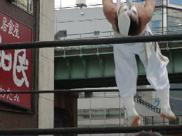 カラスコーナーに上る、「昭和」雪崩式フランケンシュタイナー(右写真)、カウント2。この技に「昭和じゃない」「それは平成だ」の声巻き起こる。「昭和」バックドロップ打って鴨居にタッチ。