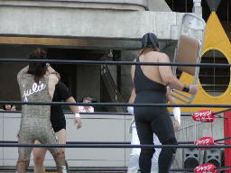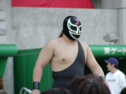 いきなり場外戦(左写真)、高偽はポイズンを売店まで連れて行く。売店で何やら缶をタイツの中に入れる高偽。ポイズンを捕らえ、