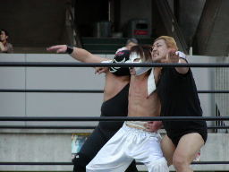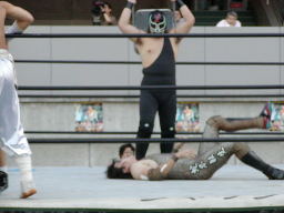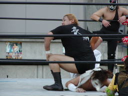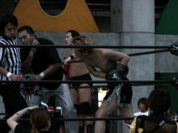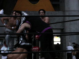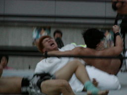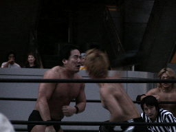 佐々木は鳥羽をコーナーに逆さ吊りにしてスライディングキック。ここんとこ佐々木と組んでこれを「やる側」だった鳥羽が久々に受ける形に。鳥羽立ち上がるとパンチ(左写真)、ウラカン・ラナからマウント取ってパンチ連打。橋本にタッチ。
