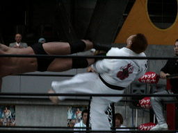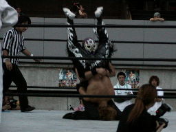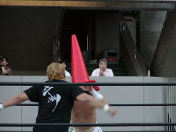 高偽リングを降りる。どこに行くのかと思ったら競技場のとこからカラーコーン持ってきてカラスにかぶせ、その上からパンチ、ラリアット(左写真)。10分経過。