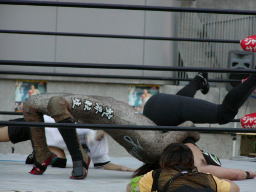 マシーンカラスに急所攻撃、カラスはポイズンにタッチ。マシーンも高偽にタッチ。ポイズン高偽にラリアット。チョークスラムからノーザンライトスープレックス、カウント2。ポイズンキャトルミューティレーション(左写真)、マシーンがカット。