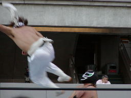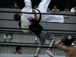 MIKAMIはロープ越えのトペ・アトミコ。助走付けて180°ブーメラン、顔面にニードロップ、セントーンと畳み掛ける。立ち上がった橋本に飛びつき十字固め、橋本持ち上げて叩き付ける。宇宙にタッチ。宇宙コーナーに振る、MIKAMIロープを越えてエプロンに出る。宇宙エルボー。宇宙一旦下がってまた突っ込む、MIKAMIトップロープを飛び越えてコルバタ(左写真)。MIKAMIドロップキック打って佐々木にタッチ。佐々木宇宙をロープに振ってドロップキック、宇宙スカしてサッカーボールキック。宇宙ラリアット、鳥羽にタッチ。鳥羽コーナーから急降下爆撃。5分経過。