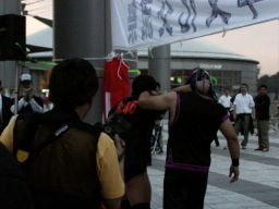 三四郎集会は階段を降りたとこの屋台に囲まれた広場で(右写真)。「いつかこの競技場で6万人集めてやってやる!」(プエルトリコ方式使わず)