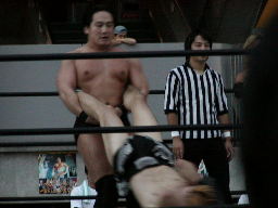 マシーンサミング、ミドルキック。ポイズンキャッチしてドラゴンスクリューから4の字固め(左写真)。高偽がひっくり返してやる。ポイズン戻す。マシーン自力でひっくり返す。ロープに。5分経過。