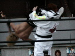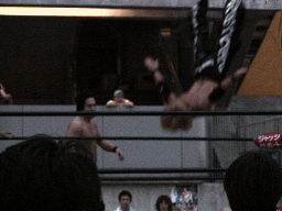 場外乱闘でスタート。宇宙と高木は客席を越えて広い通路まで出る(左写真)。MIKAMIは橋本と客席で乱闘。佐々木はリング上で鳥羽を捕らえ