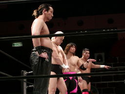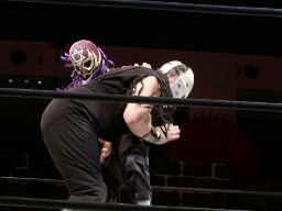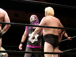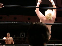 GENTAROが羽交い絞めして石井がラリアット、MIKAMIかわしてGENATROに誤爆(右写真)、MIKAMIが石井をスクールボーイ、カウント3。