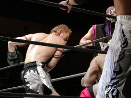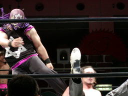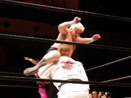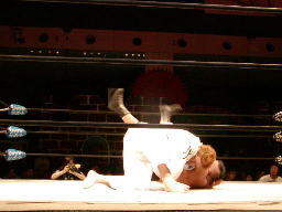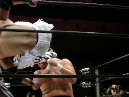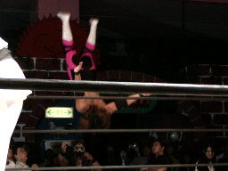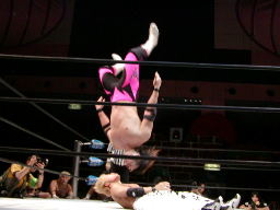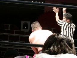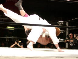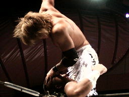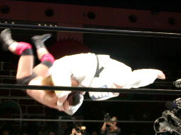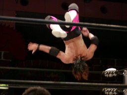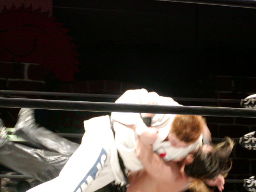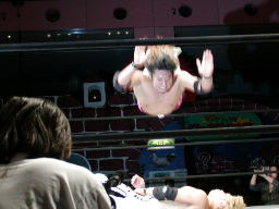 GENTAROシューティングスタープレス(右写真)、MIKAMIかわす。MIKAMIコーナーに上ってミサイルキック、再度上ってスワントーンボム、高偽がカット。