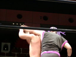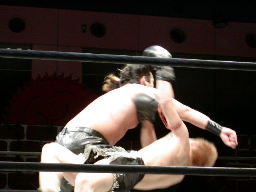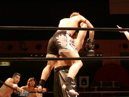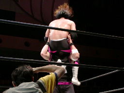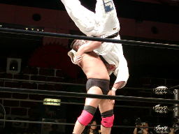 鳥羽パンチ、YOSHIYAかわしてフルネルソンスラム(左写真)、場外に放り出す。場外では石井が待ち構えて投げっ放しジャーマン、リングに戻す。