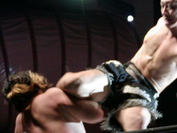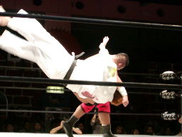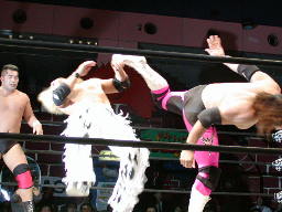 GENTARO入り、MIKAMIのお株を奪うローリング張り手からバックドロップ2連発(右写真)。