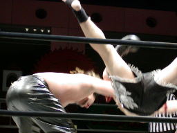 先発はMIKAMIと高偽 高偽ヘッドロック、MIKAMIロープに振る、高偽タックル、ロープに飛ぶ、MIKAMIコルバタ(左写真)。MIKAMI首投げ、宇宙にタッチ。