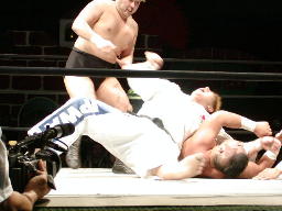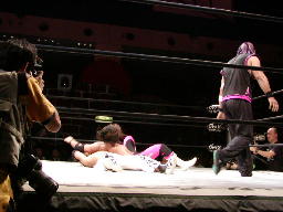 MIKAMIを持ち上げてパワーボム式セントーン、かと思ったらくるっと方向転換してMIKAMIをパワーボム、その上にGENTAROを乗せる(右写真)。カウント3。