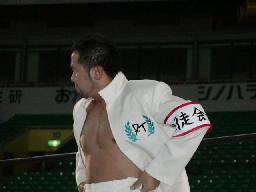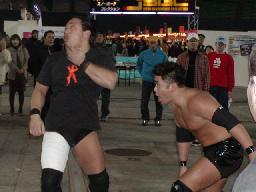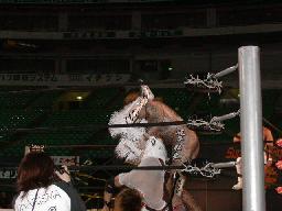 高木と川内も客席の後ろのほうでチョップ合戦(右写真)、ラリアット相打ち。高木の太ももにはテーピングがぐるぐる巻き。