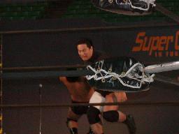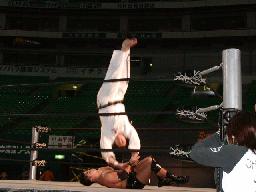 婆沙羅も川内にタッチ。橋本腰投げ、STO、カウント2。コーナーに上ってトペ・アトミコ(右写真)。