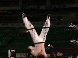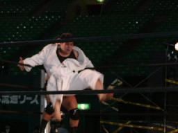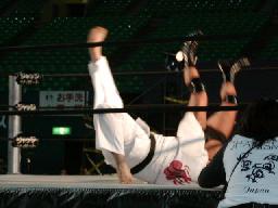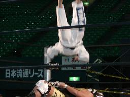鳥羽コーナーからダイブしてのキック、パンチ、コーナーに振ってジャンピングハイキック(右写真)、ラ・マヒストラルで丸め込む、カウントは2。
