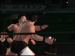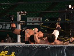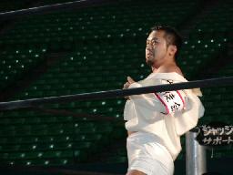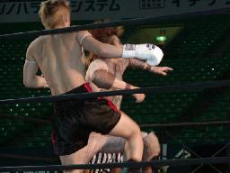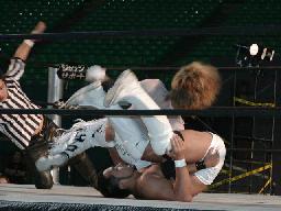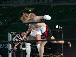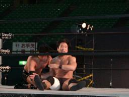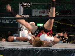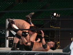 鳥羽コーナーに振って飛びヒザ蹴り、佐々木かわして投げっ放しジャーマン(右写真)。佐々木バック取る、鳥羽オーバーヘッドキック、バックブロー。