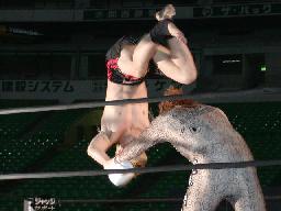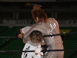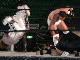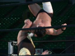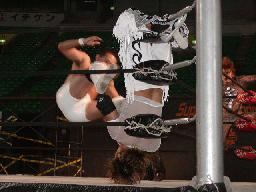 婆沙羅コーナーに振る、高木切り返してすくい投げ、ストンピング打って橋本にタッチ。橋本モリガンズ・ボム、カウント2。コーナーに振ってスプラッシュ、コーナーを使ってリバーっスプラッシュ(左写真)、高木にタッチ。