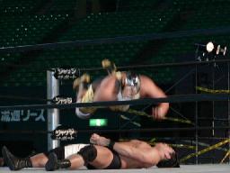 婆沙羅入って串刺しラリアット2連発、ダブルのフェースクラッシャー。婆沙羅ボディスラム、コーナーに上ってダイビングプレス(左写真)、カウント2。高木をコーナーに振る、高木セカンドコーナーに上り、さらにピンポンパン狙うが足がうまく上がらず落下。なんとかドロップキックを放って橋本にタッチ。10分経過。